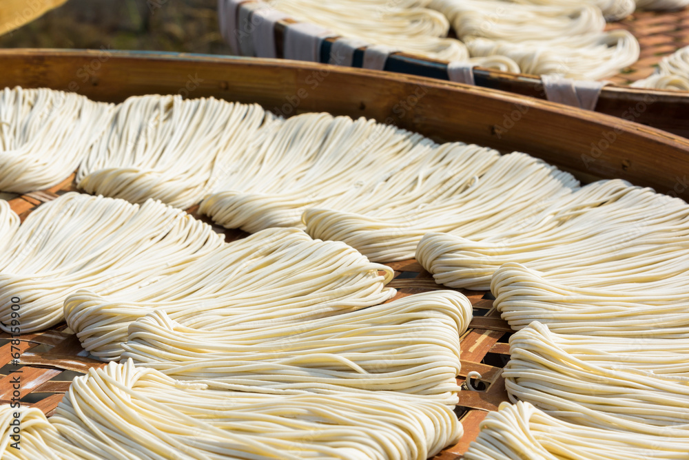 Close-up of traditional handmade noodle-making drying outdoors in Guanmiao, Tainan, Taiwan.