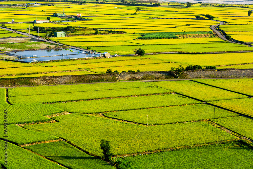 Overlooking views of rice fields in the Waipu Lotus Valley Taichung, Taiwan.
