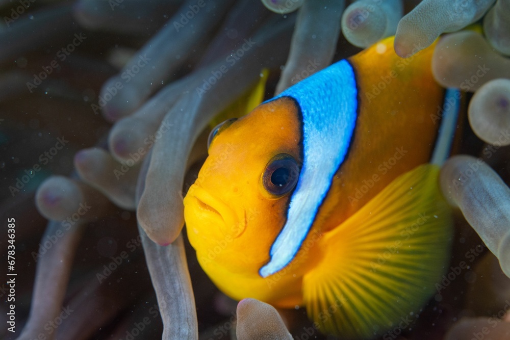 yellow fish with white chest surrounded by sea life in ocean