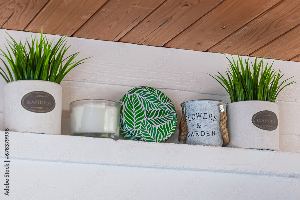Artificial flowers in white vases stand on a shelf in the house, home decor has a place for