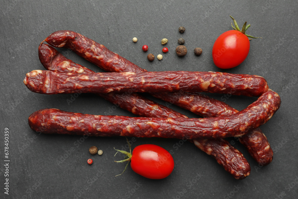 Many thin dry smoked sausages, peppercorns and tomatoes on black table, flat lay