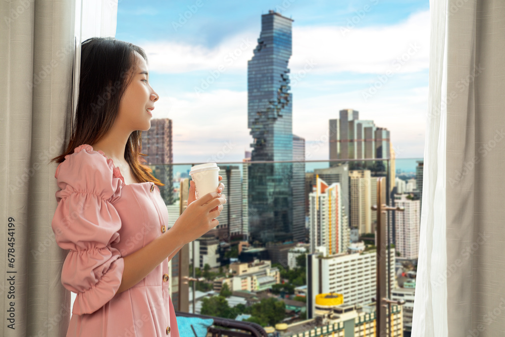 Asian woman read and checking travel location on a paper map in her hotel room with curtain and view outside