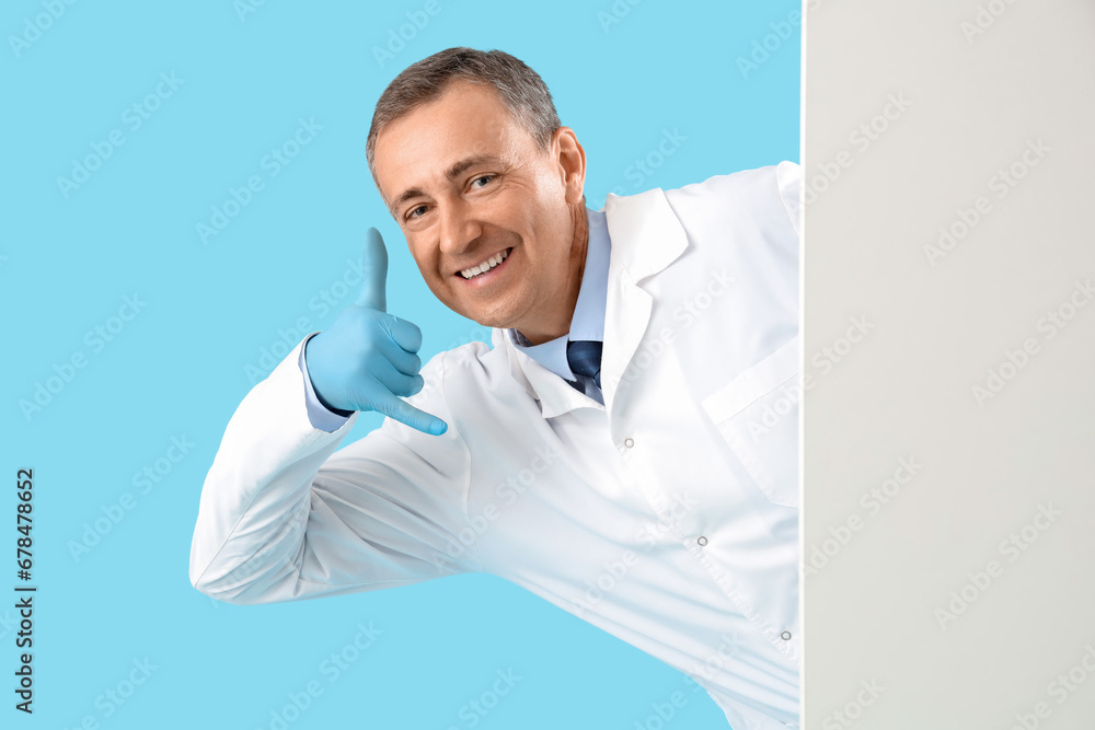 Mature doctor with blank poster showing "call me" gesture on blue background