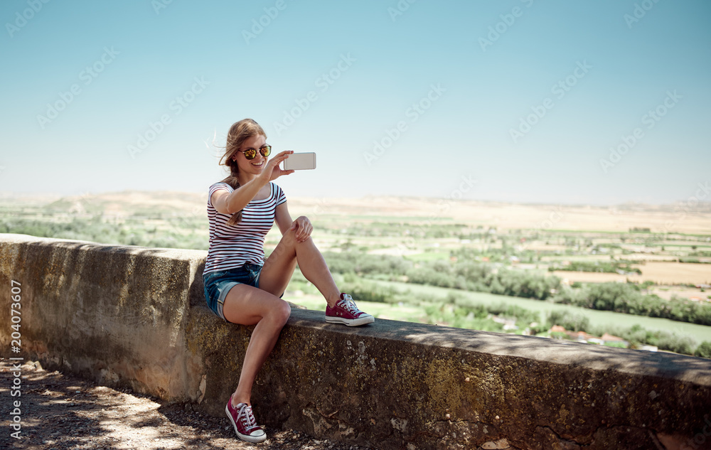 Colorful autumn landscape with golden leaves on trees turquoise stormy mountain river in sunshine. Bright scenery with mountain river and yellow trees in autumn colors in fall time.