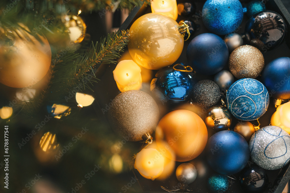 Large cardboard box with Christmas balls and Christmas tree decorations. New Year home decorations. Traditional celebration.