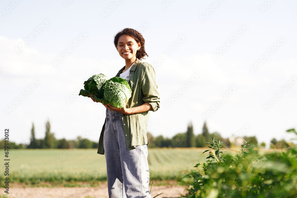 Smiling female farmer in uniform working in cabbage field during harvest. Agricultural activity