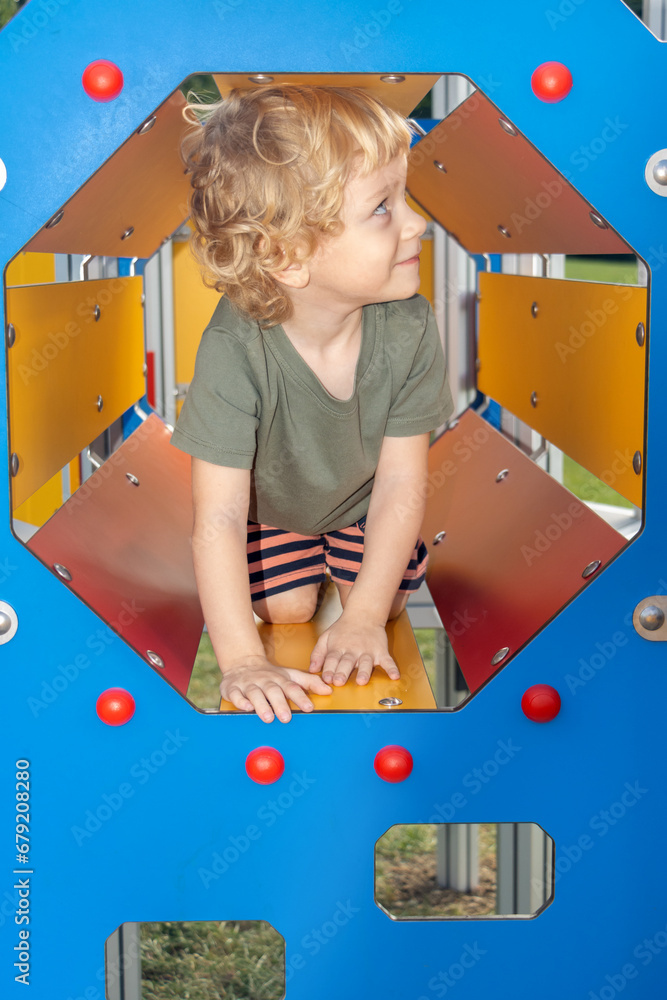 A little boy inside a climbing frame on a playground
