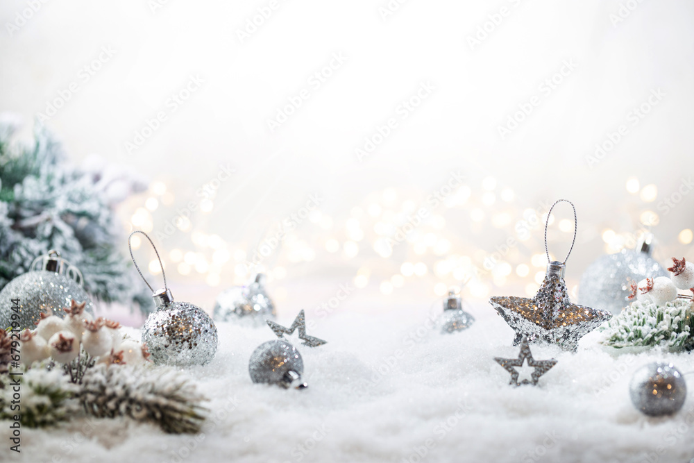 Christmas silver decorations on snow with fir tree branches and christmas lights. Winter Decoration Background