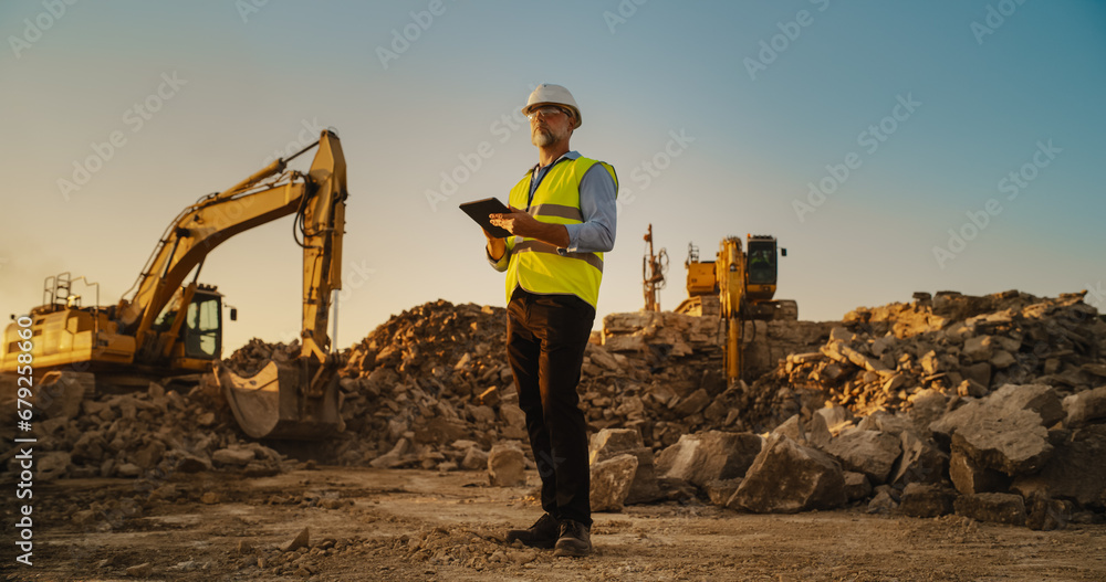 Caucasian Male Real Estate Investor Wearing Protective Goggles And Using Tablet On Construction Site On A Sunny Day. Man Inspecting Building Progress. Excavator Loading Materials Into Industrial Truck