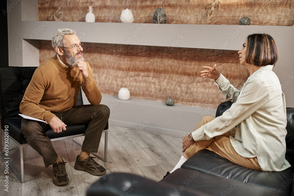bearded middle aged psychologist in glasses talking to female client during therapy session