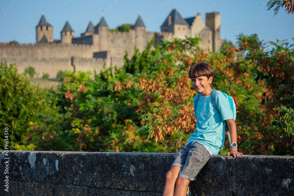 Happy teen enjoy medieval Carcassonne city view during sunset