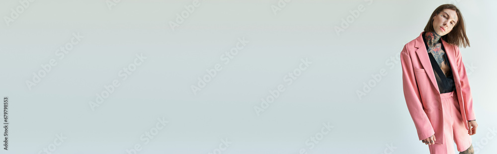 good looking young man in pink blazer and shorts looking at camera, fashion concept, banner