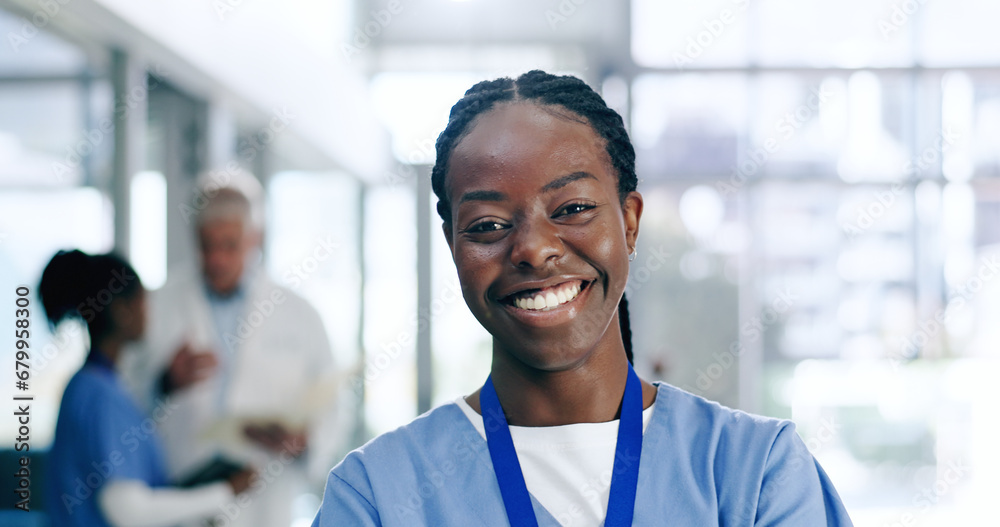 Nurse, woman and portrait with smile in hospital or clinic for healthcare, service or medical support. Medicine, black person and professional with happy, confident and pride for career or wellness
