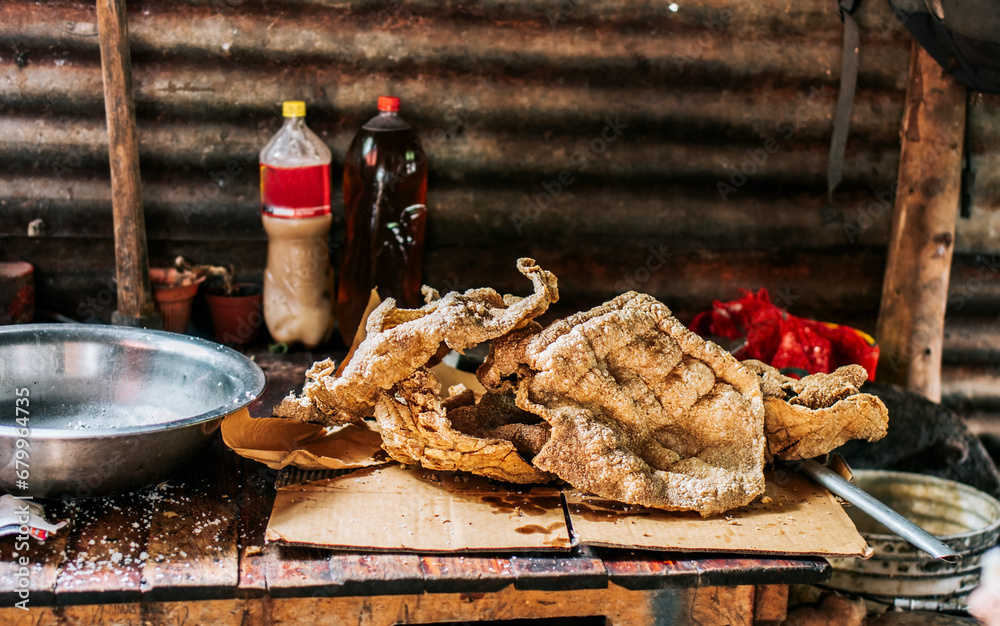Homemade Nicaraguan chicharron served on table. Close up of homemade chicharron on the table