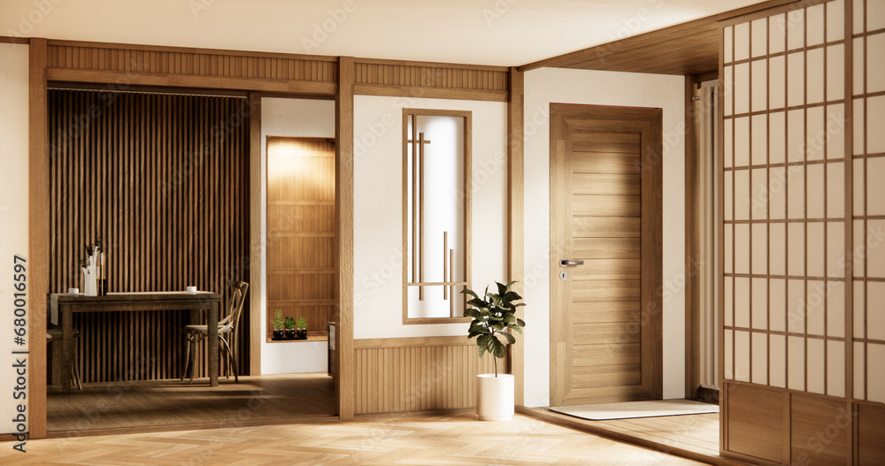 dinner room japanese style with long table and wooden chairs in room japandi.