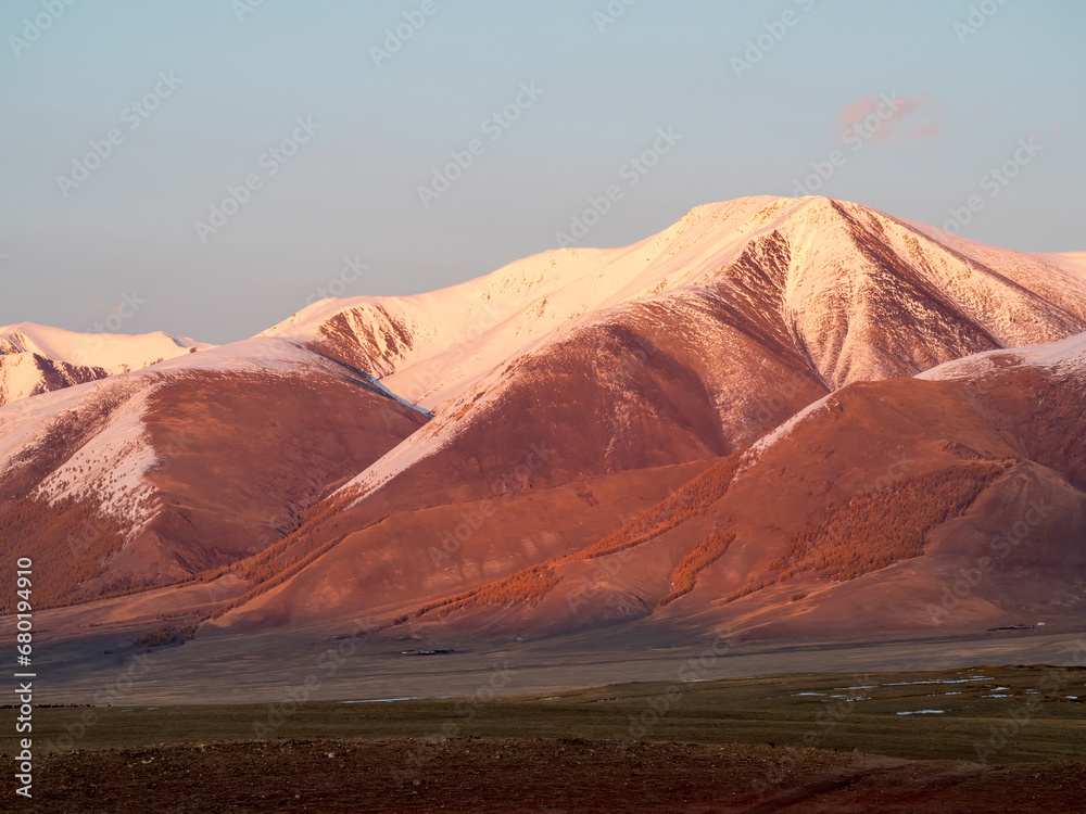 Red mountains are covered with snow at sunset. Altai mountains. Beautiful highland landscape.
