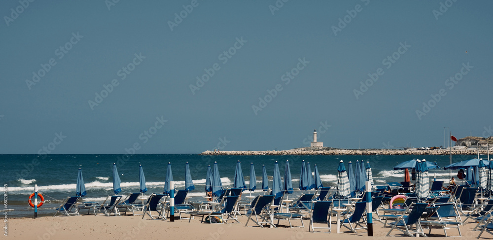 Spiaggia con molti ombrelloni e sdraio con lo sfondo di Vieste