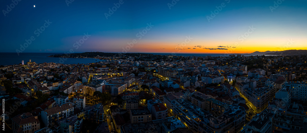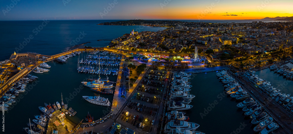 Sunset view of Antibes, a resort town between Cannes and Nice on the French Riviera
