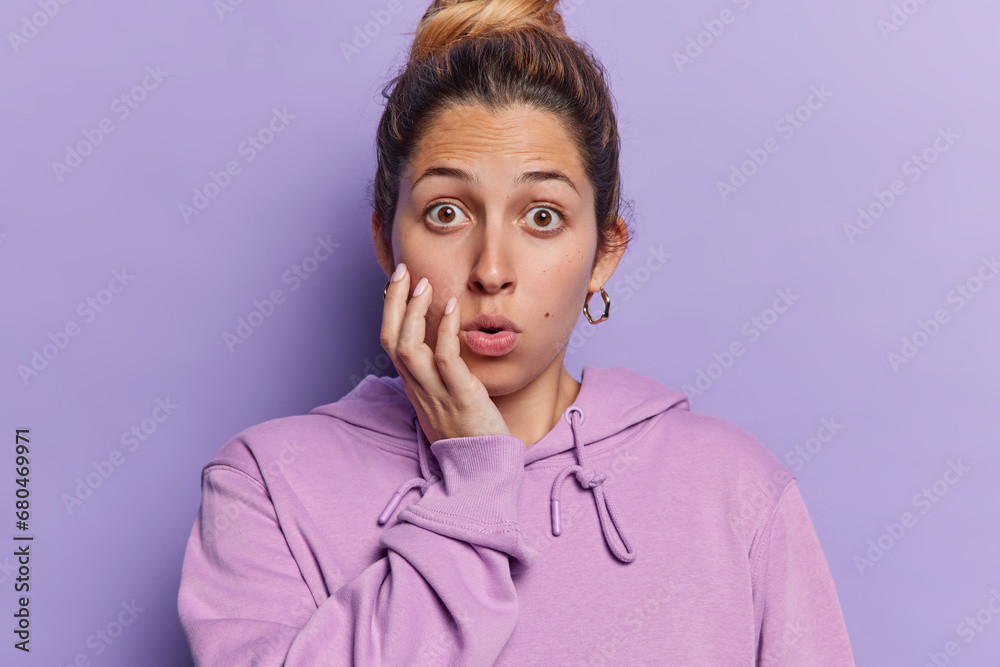 Photo of stunned young woman reacts to something shocking keeps hand on cheek wears casual hoodie cannot believe own eyes poses against purple background. Human reactions and feelings concept