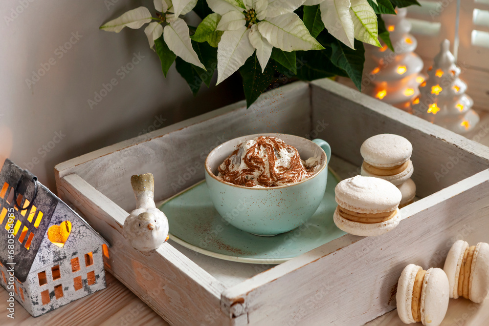 Festive Christmas New Year still life composition hot drink mug with coffee cream and cinnamon, french macaroon, macaron