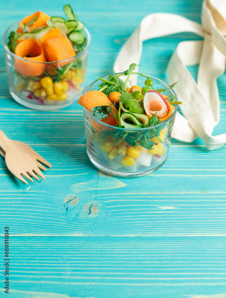 Healthy snack in a glass bowl. on a blue wooden background with eco-friendly cutlery.