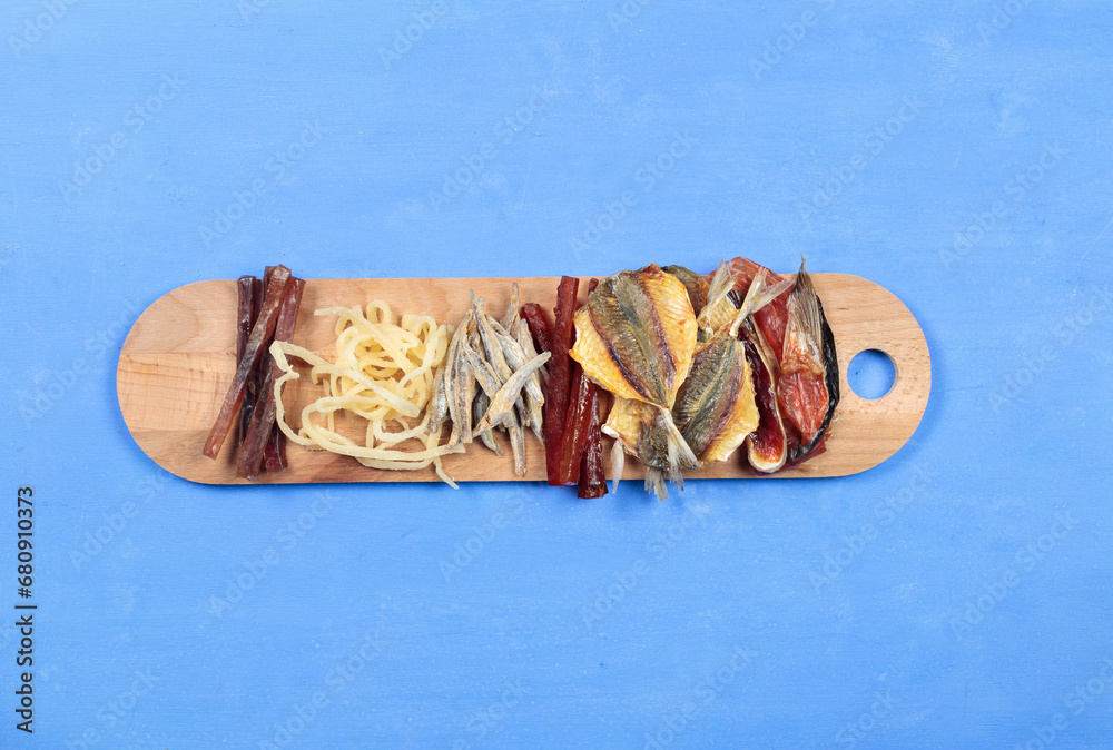 Tapas, dried fish and squid for beer. A board with snacks. Top view on a blue background.