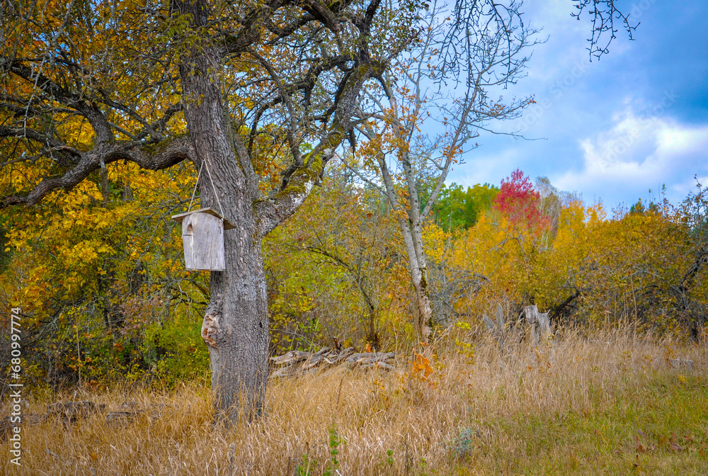 Wooden birdhouse on tree trunk. Autumn rural landscape. Quality image for your project