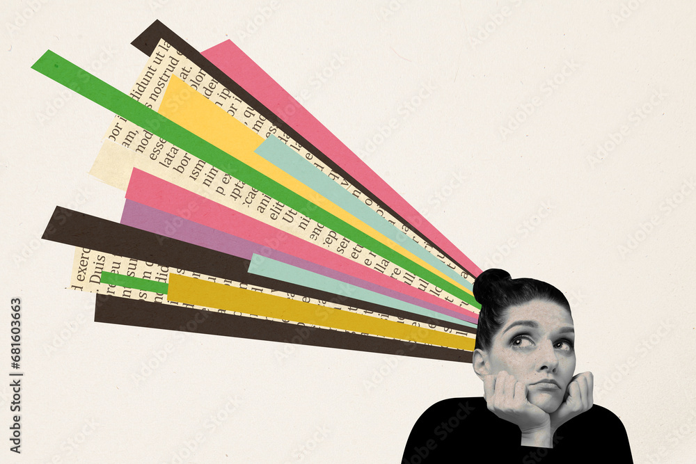 Photo comics sketch collage picture of unhappy sad lady having many crazy thoughts inside head isolated white color background