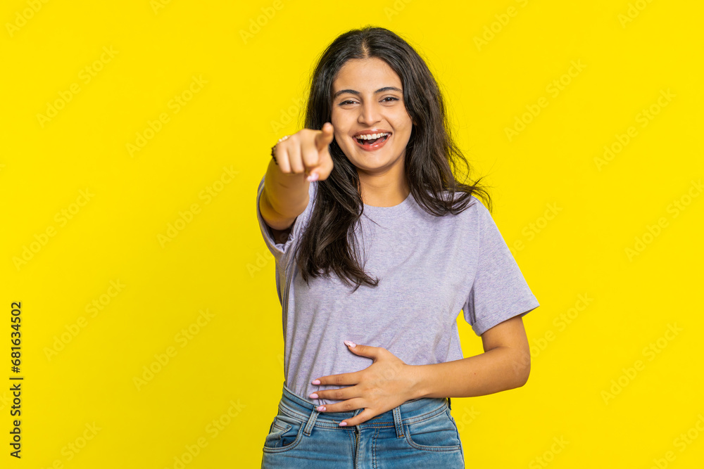 Happy Indian young woman laughing out loud after hearing ridiculous anecdote, reaction on funny joke, feeling carefree amused. Positive people lifestyle. Arabian girl isolated on yellow background