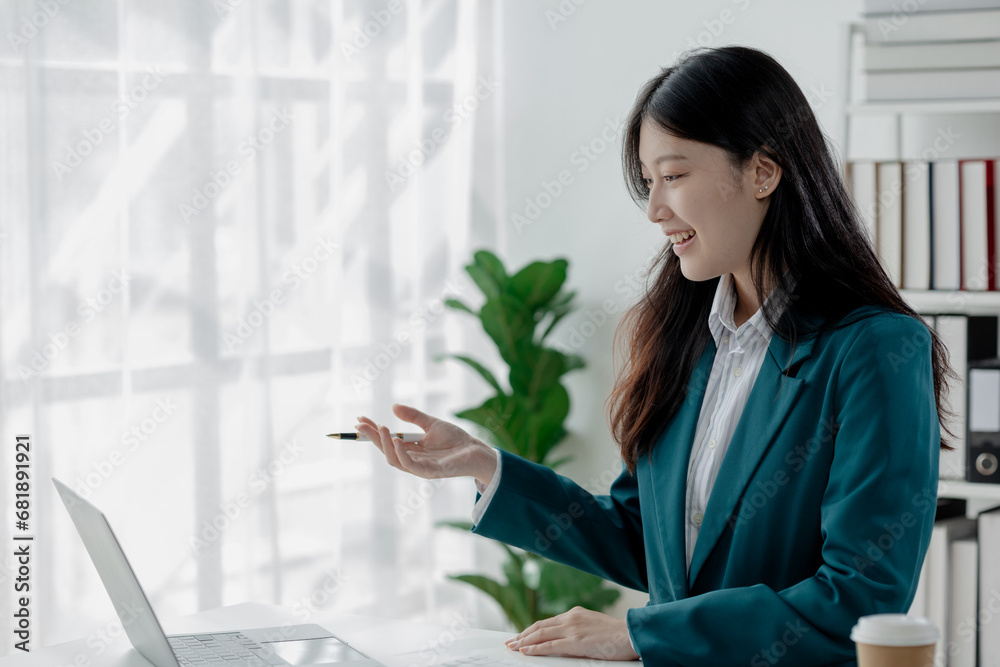 Businesswoman is sitting and working in the office, Employee is looking for information on laptop, Recording various information on paper,