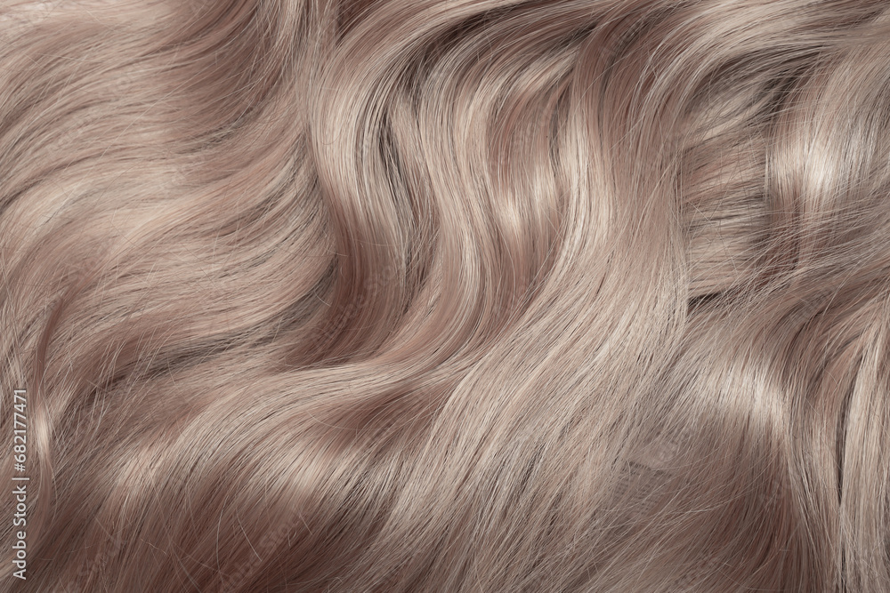 Blond hair close-up as a background. Women's long light brown hair. Beautifully styled wavy shiny curls. Hair coloring. Hairdressing procedures, extension.