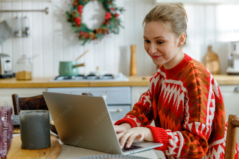 young smiling woman sits in cozy kitchen with christmas decorations. looks contented, types on laptop keyboard, looking social network, doing online shopping, remote working or distance education
