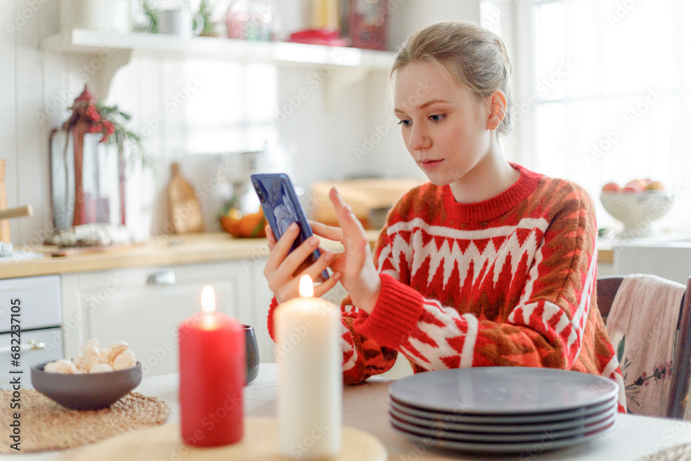 young blonde pensive woman in red sweater sits in cozy kitchen with Christmas decorations. looks calm in smartphone screen