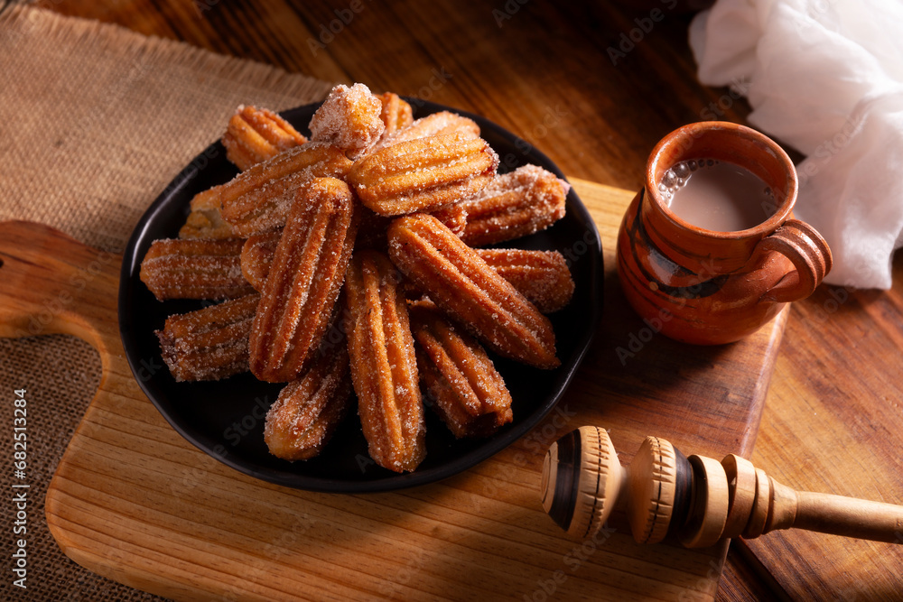 Churros. Fried wheat flour dough, a very popular sweet snack in Spain, Mexico and other countries where it is customary to eat them for breakfast or snack accompanied by hot chocolate or coffee.
