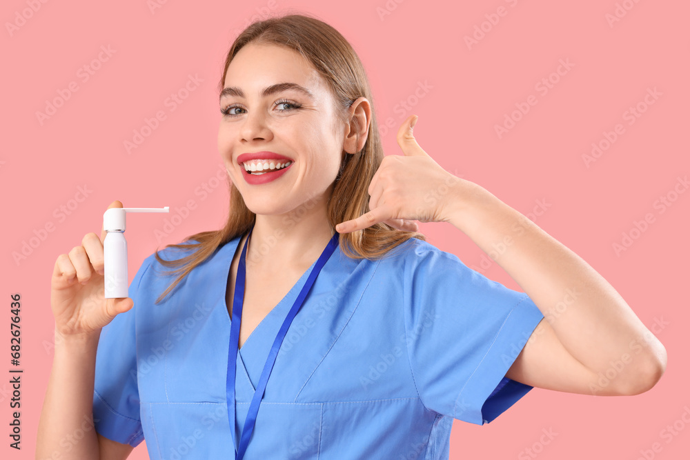 Female doctor with spray bottle showing "call me" gesture on pink background