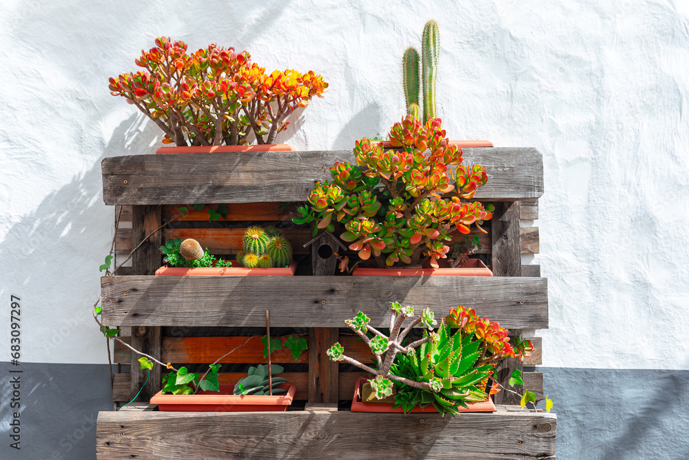 Cactuses and succulents in a wooden box on a white wall part of street decoration