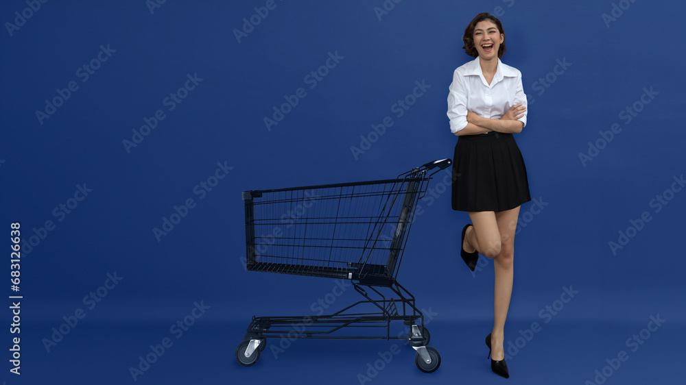 Full length portrait of Asian woman with empty shopping cart or shopping trolley isolated on deep blue background