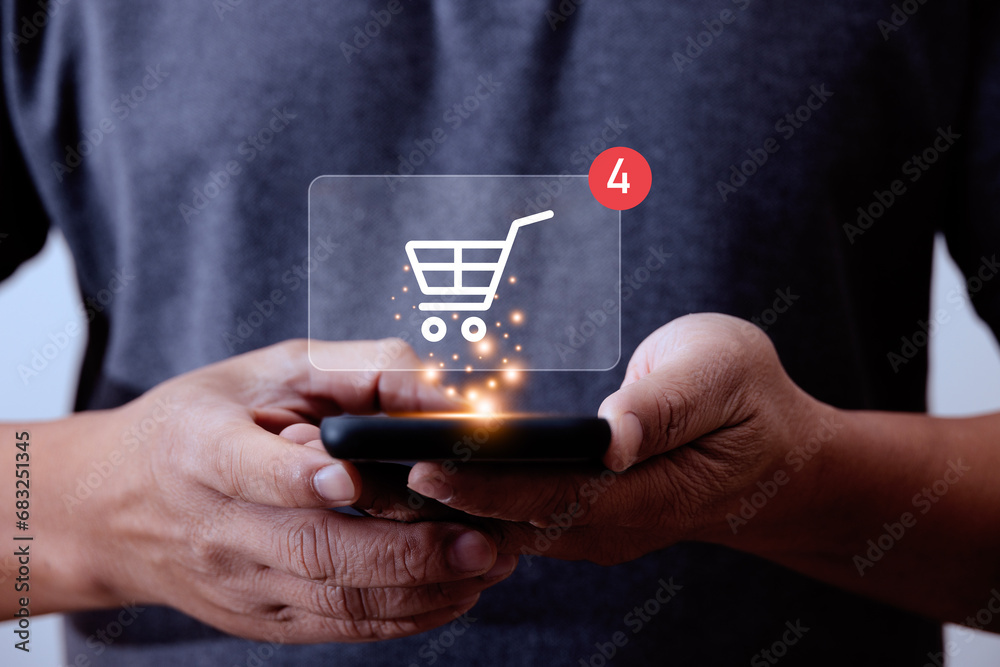 person hand using smartphone for shopping online, buy in online shop by mobile smart phone app, with shopping cart icon, sale volume increase make business growth and shopping online concept.