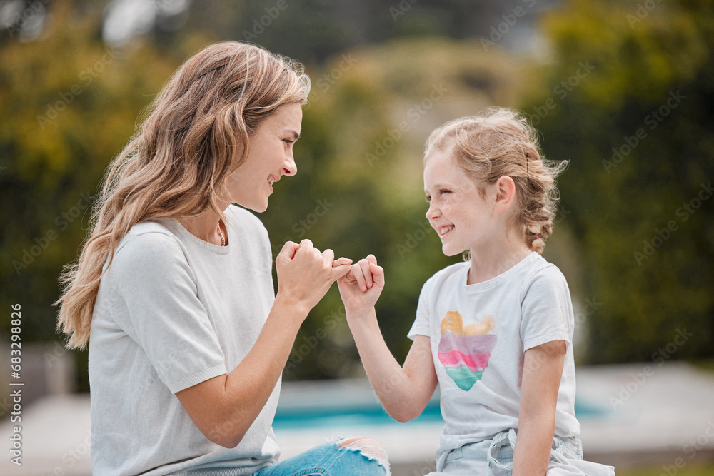 Outdoor, swear and mother with girl, pinky promise and relax with happiness, bonding or commitment link. Family, mama or kid with hand gesture, support or love in a park, secret or nature with trust