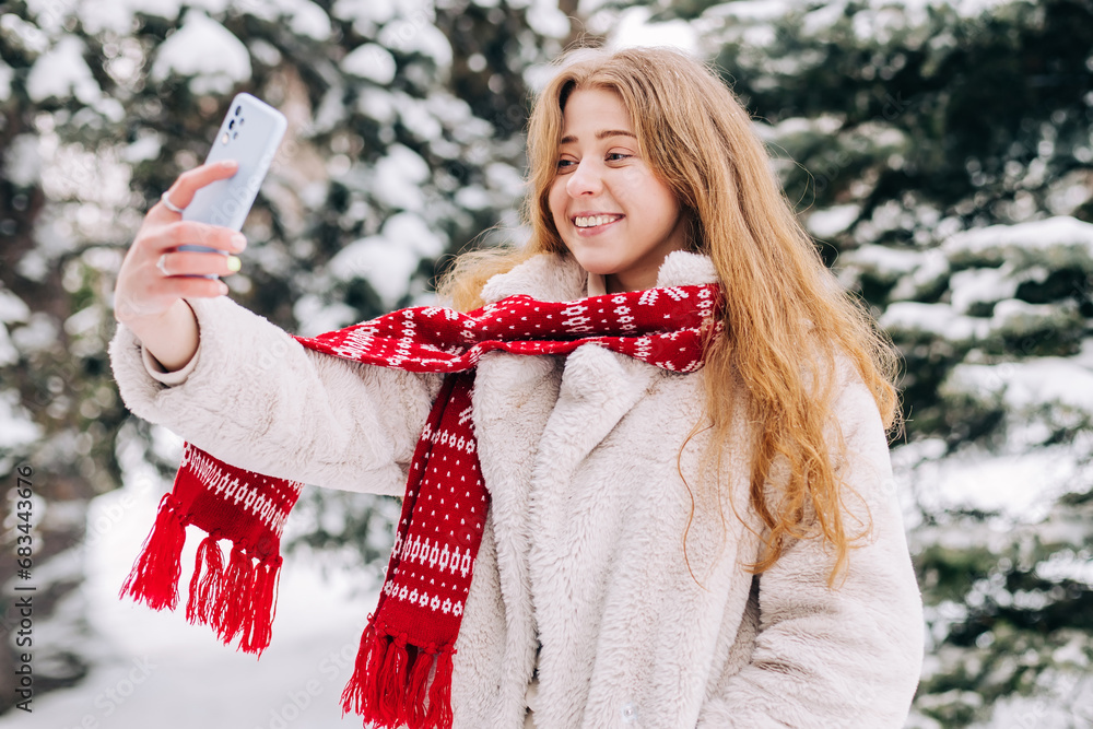 Young woman dressed in a fur coat and a red Christmas scarf takes a selfie outdoors in winter