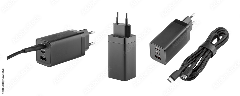 AC charger with USB and Type-C connector on isolated and white background, close-up