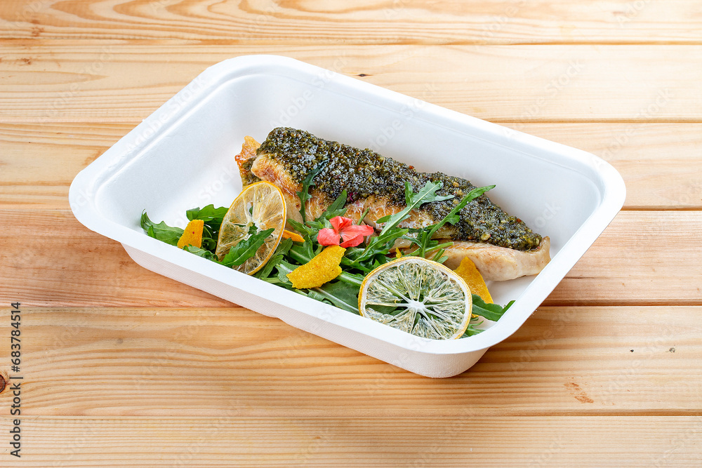 Hake with green beans and pesto sauce. Healthy diet. Takeaway food. Ecological packaging. On a wooden background.