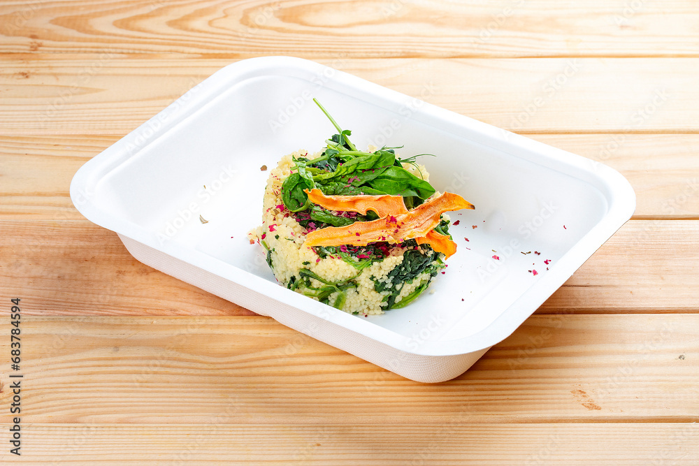 Couscous with spinach. Healthy diet. Takeaway food. Eco packaging. On a wooden background.