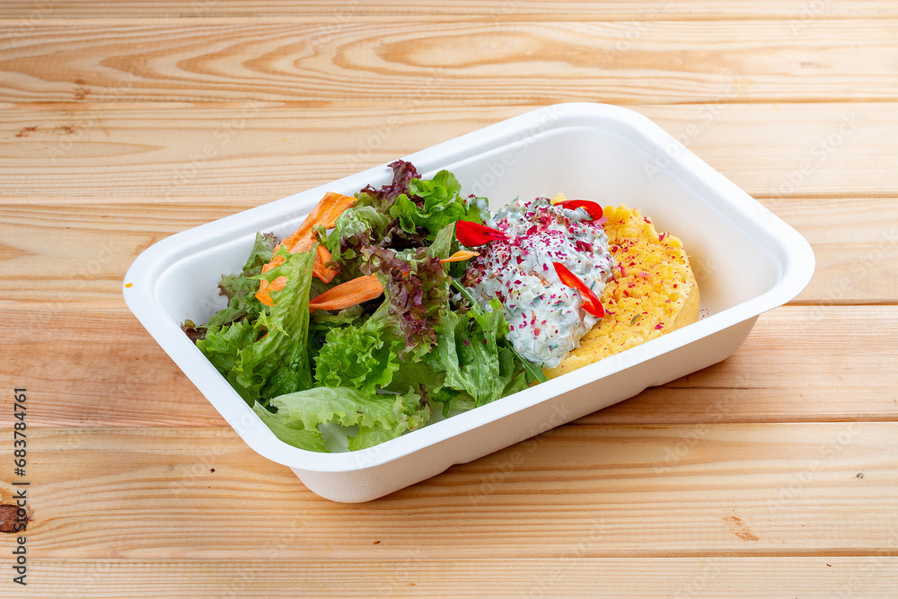 Polenta with tartare and avocado. Healthy diet. Takeaway food. Ecological packaging. On a wooden background.