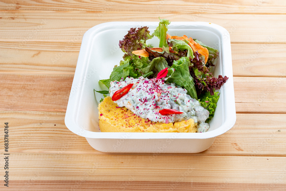 Polenta with tartare and avocado. Healthy diet. Takeaway food. Ecological packaging. On a wooden background.