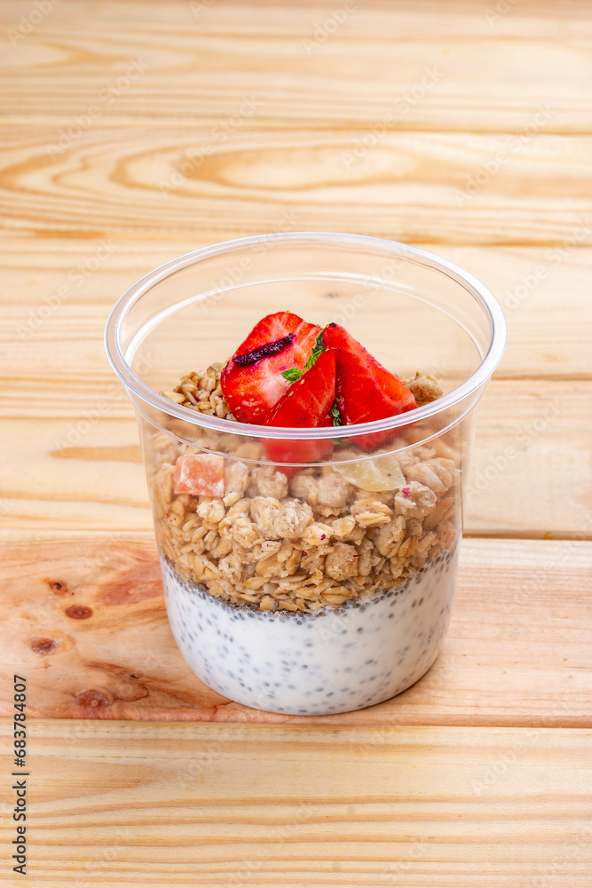 Granola with chia pudding. Healthy diet. Takeaway food. Eco packaging. On a wooden background.