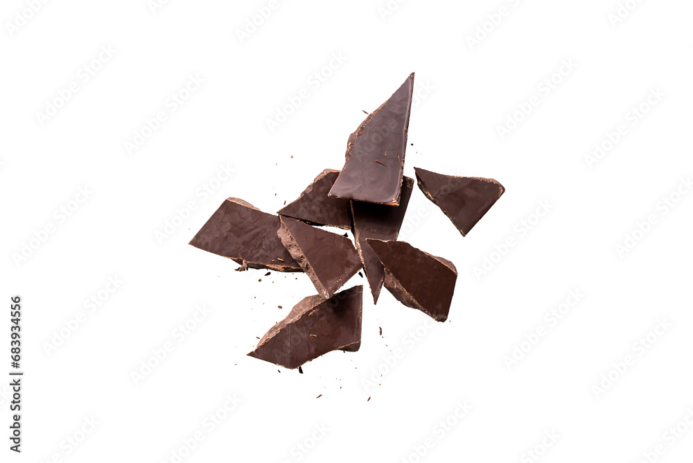 Broken organic dark chocolate bar isolated on a transparent background without shadow from above, top view