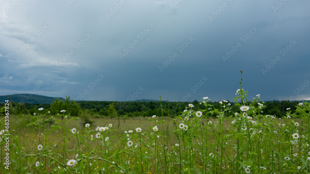 White dandelion flowers growing on a field in a rural area. Behind them lies an oak forest. Overcast weather. Storm is approaching. Romania.