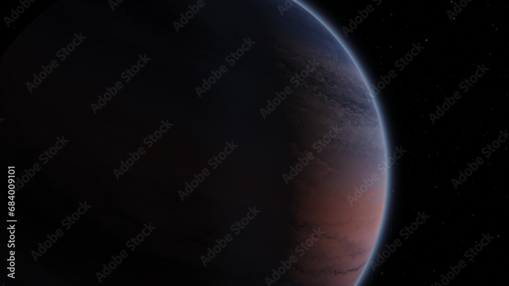 Giant gas planet in deep dark outer space. Artistic concept 3D illustration of big Jupiter-like alien exoplanet. Space exploration and planetary science discovery of inhabitable extrasolar gas planet