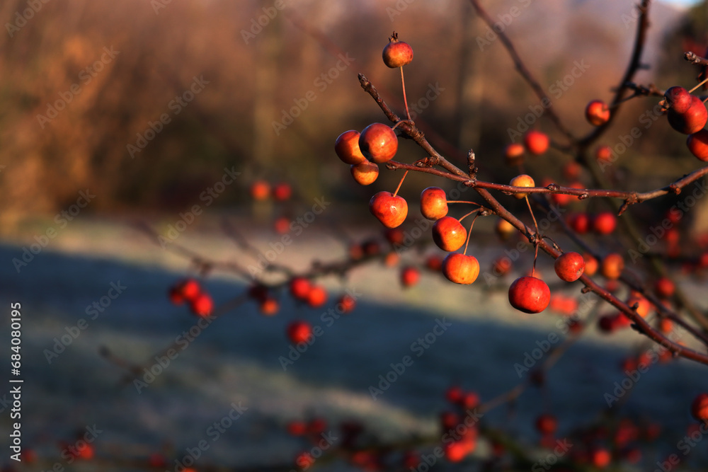 Small red apples on branch in the winter garden with copy space. Winter background with selective focus